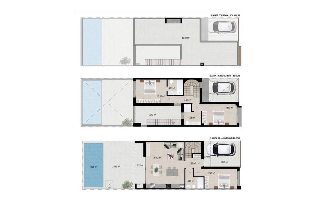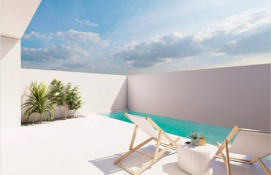 Uw droomhuis wordt werkelijkheid! Een modern en exclusief wooncomplex met alles wat u nodig heeft om het leven te beginnen waar u altijd al van hebt gedroomd.~Met 125,27 m² bebouwde oppervlakte zijn de woningen ingedeeld in ruime en lichte vertrekken. Op de begane grond vindt u een woon-eetkamer met een geïntegreerde, volledig uitgeruste keuken in houttint met een Silestone-werkblad, met directe toegang tot een prachtig tuin met privézwembad, evenals een complete slaapkamer en een badkamer.~Op de bovenverdieping bevinden zich nog twee tweepersoonsslaapkamers, beide met en-suite badkamer. De woningen beschikken tevens over een privé-solarium met buitenkeuken — perfect om te genieten van lange avonden in het uitstekende klimaat van de regio.~Ze hebben een eigen voetgangersingang en een garage en zijn gebouwd met hoogwaardige materialen: keramische vloer binnen en buiten, met vrije keuze; veiligheidsdeur; PVC kozijnen met dubbele beglazing; wit gelakte binnendeuren en inbouwkasten. Daarnaast is er een pre-installatie voor kanaalairconditioning op beide verdiepingen en LED-verlichting binnen en buiten.~Gelegen in een rustige omgeving met goede buren, dichtbij het centrum met alle voorzieningen, zoals restaurants, supermarkten, scholen, enz., en op minder dan 10 minuten rijden van de prachtige stranden van de Mar Menor. Een exclusief wooncomplex in San Javier, Murcia. Mis deze kans niet — neem contact met ons op!~~