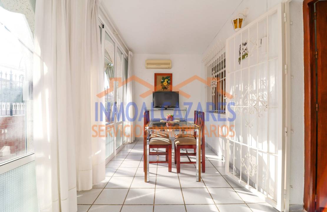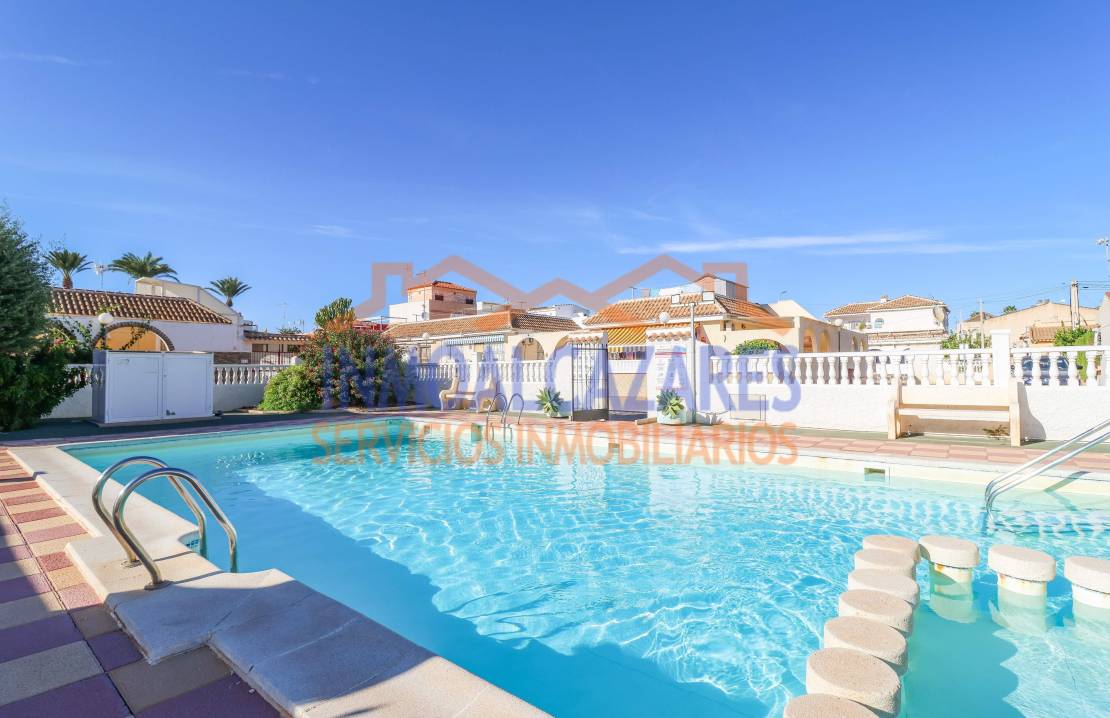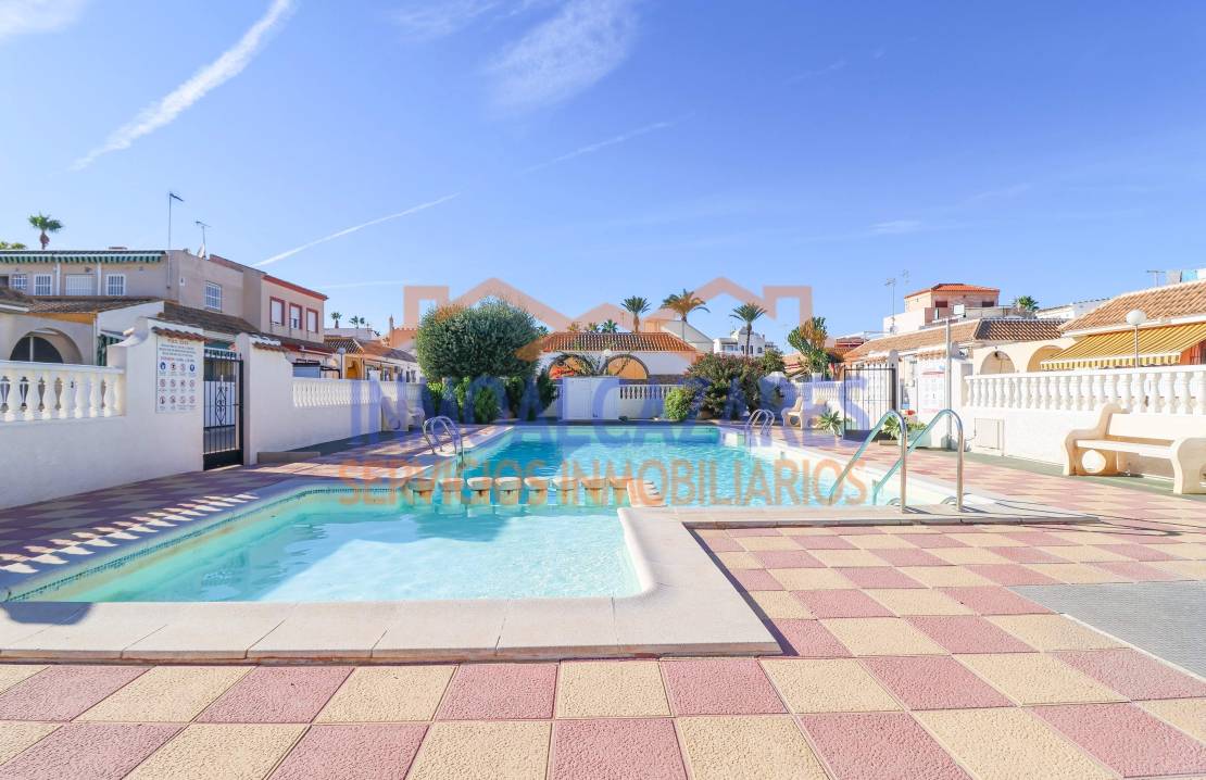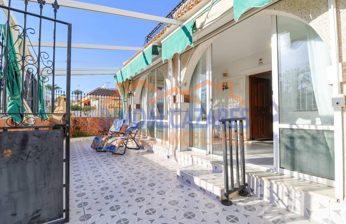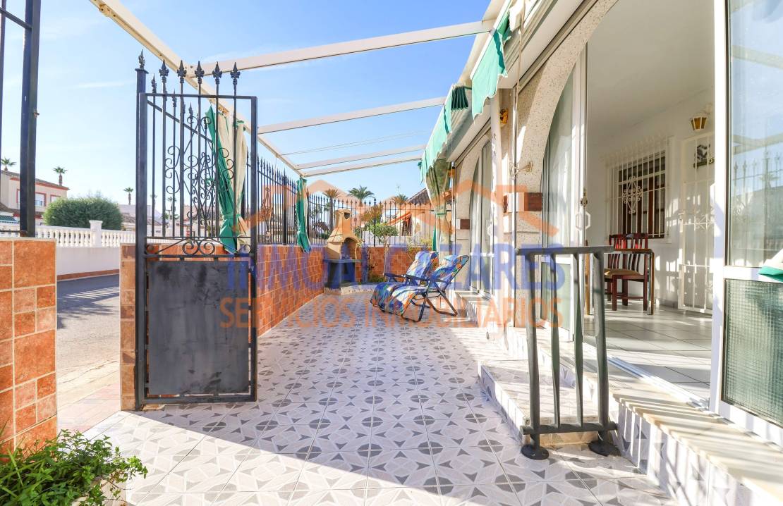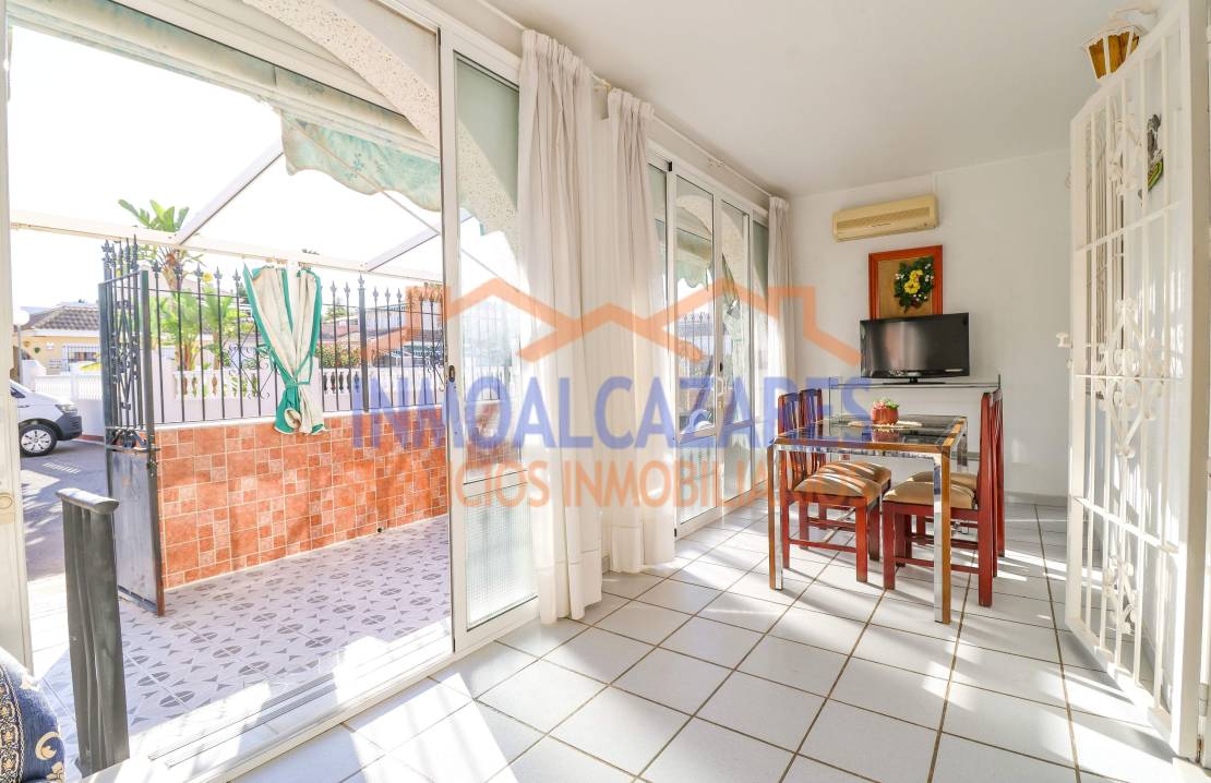 ¡Exclusiva! Te presentamos una oportunidad única, este precioso bungalow planta baja en esquina, en una urbanización privada, con piscina comunitaria, un vecindario que goza de tranquilidad y buenos vecinos, y, además, unos jardines hermosos.~Dispone en su frente de un precioso jardín enlosado y un porche acristalado, que que invita a disfrutar los mejores momentos en buena compañía. Al entrar, encontramos el salón-comedor, muy luminoso, cocina independiente totalmente equipada y con electrodomésticos, con salida a un patio interior, tres habitaciones y dos baños, uno de ellos en suite con la habitación principal.~Totalmente amueblada, super cuidada, con aire acondicionado, y con armarios empotrados. Su orientación es SUROESTE. Recalcamos también su ubicación inmejorable, cerca de supermercados y zonas de ocio. Un hogar ideal para tus vacaciones o vivir todo el año y a tan solo 10 minutos de la playa, en Los Narejos, Los Alcázares, Murcia.~